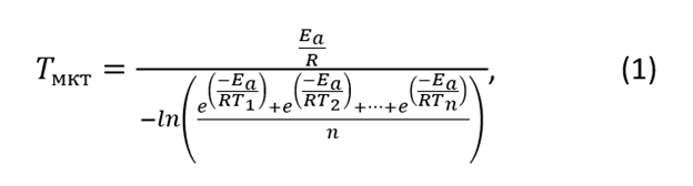 С помощью этого уравнения получают взвешенный результат для каждой точки измерения данных относительно всех других точек получения данных, рассматриваемых в исследовании, поэтому небольшие отклонения от нормальной работы зоны хранения, такой как загрузка и ли перемещение лекарственных средств или открытие ворот, дверей, не окажут существенного влияния на вычисление средней температуры в конкретном расположении зоны хранения.